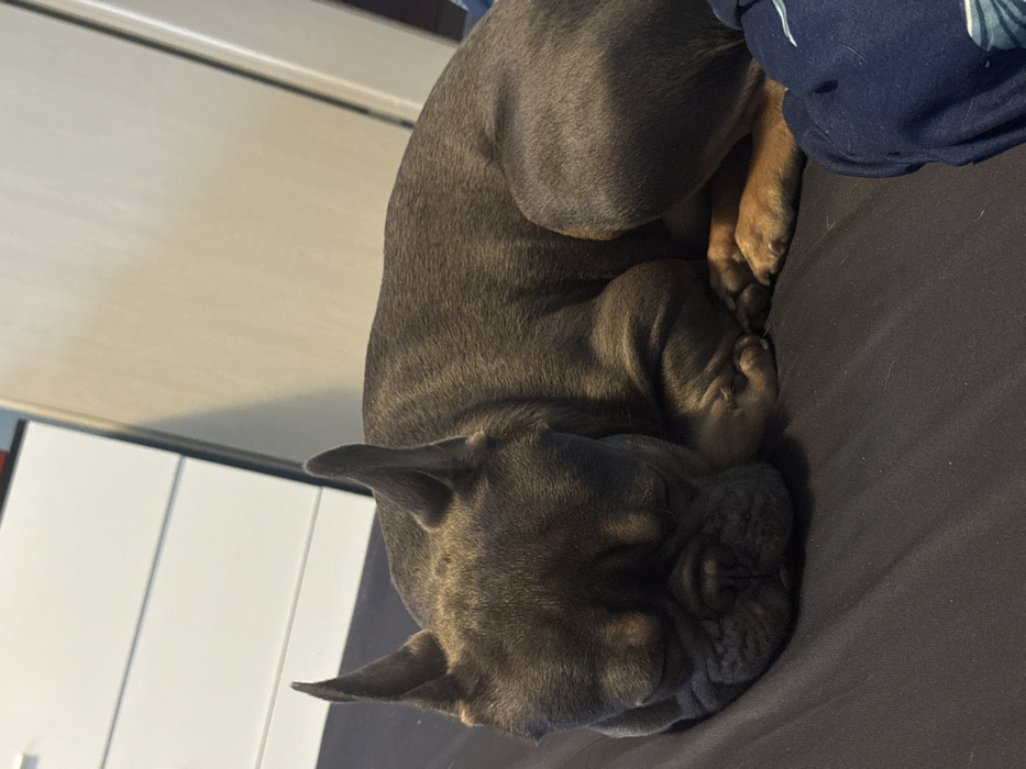 - "A French Bulldog, possessing a 'blue and tan' coat, is depicted lying dormant on a dark, horizontally striped textile surface" by FM-zYmeX2, licensed under CC BY 4.0