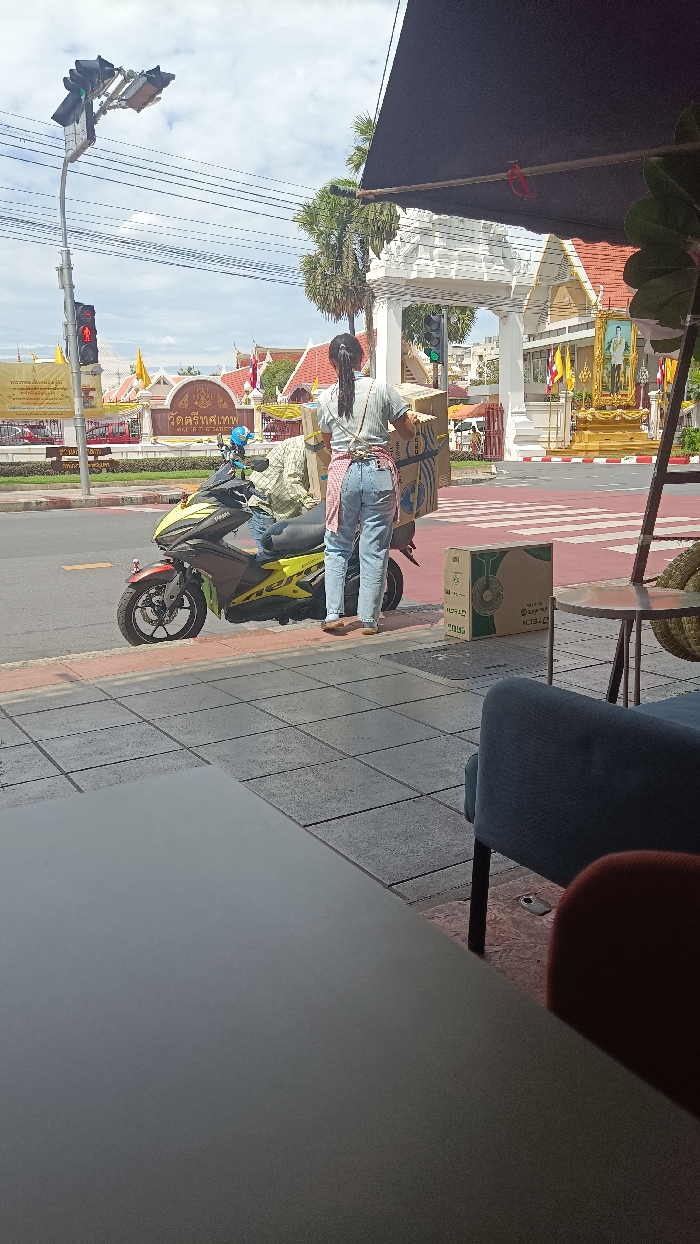 The image depicts a daytime street scene in Bangkok, Thailand, observed from an indoor or covered outdoor seating area. In the background, the Wat Trithotsathep temple complex is prominently visible, identifiable by a brown sign with "วัดตรีทศเทพ" (Wat Trithotsathep) in Thai script. The temple features traditional Thai architecture with red-tiled roofs, white ornate structures, golden accents, and a large golden portrait of a monarch. On the street, a yellow and black Yamaha scooter (likely an Aerox model) is parked partially on the asphalt road and partially on the sidewalk. A male individual, wearing a plaid shirt, is seated on the scooter. Standing immediately adjacent to the scooter, facing away from the viewer, is a female individual. She wears a light-colored striped shirt, blue jeans, a light pink checkered apron, and flat shoes, with her dark hair tied up. She holds a large cardboard box. A second large cardboard box is secured to the rear of the scooter. On the tiled sidewalk to the right, a green cardboard box, featuring a fan icon, rests near a small round metal table. The environment includes an asphalt road with white pedestrian crossing markings, a concrete sidewalk, and overhead power lines. A traffic light pole with multiple signal heads (showing both red and green lights) stands at an intersection. Palm trees and other foliage are visible against a partly cloudy sky. In the immediate foreground, a dark tabletop, grey floor tiles, and the backs of blue and orange upholstered chairs are present, partially obscured by a black awning overhead to the right.
