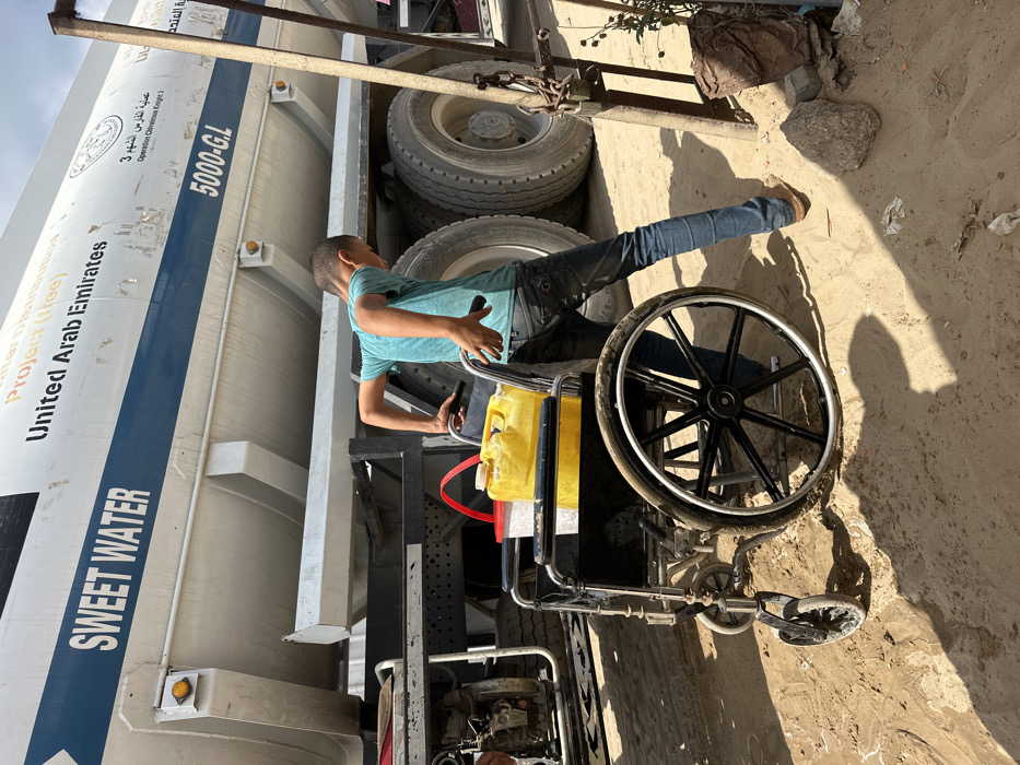 A young male, wearing a teal t-shirt, dark blue jeans, and light brown sandals, is observed from a slightly elevated perspective, pushing a manual wheelchair across a sandy, light-brown ground. His hands are positioned on the wheelchair's push handles, and his body is angled, suggesting effort or direction. The wheelchair, featuring a chrome frame, black fabric seat and backrest, black large rear wheels, and smaller front caster wheels, is laden with two containers: a yellow plastic jerrycan lying horizontally and a red plastic bucket with a white lid, both resting on the seat. In the background, a large white cylindrical water tanker truck is stationary. The tanker's side prominently displays "SWEET WATER" in blue lettering, along with "United Arab Emirates" and "Project (free)" in both English and Arabic script. A capacity of "5000-G.L" is also visible. Multiple large tires, indicative of a heavy-duty vehicle, are partially obscured by the boy and wheelchair. Mechanical components, possibly part of a pump system, are visible at the front left of the truck. To the right of the boy, a weathered, dark-colored support post or structure stands in the sand, with small dry plants at its base and a crumpled brown object. The scene is brightly lit by direct sunlight, casting distinct shadows from the subjects onto the sandy ground. The location is the city of Al-Mawasi, Unknown.