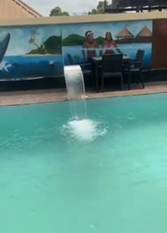 small swimming pool with a manmade waterfall feature at one end. The water in the pool appears clean and turquoise in color. A red inflatable ring floats in the pool. Behind the pool is a wall with a painted mural showing a tropical scene, complete with a whale leaping from the water, a small island with palm trees and a hut, and two figures seated at a table. Above the wall, metal water tanks are visible. The day appears sunny with some cloud cover.