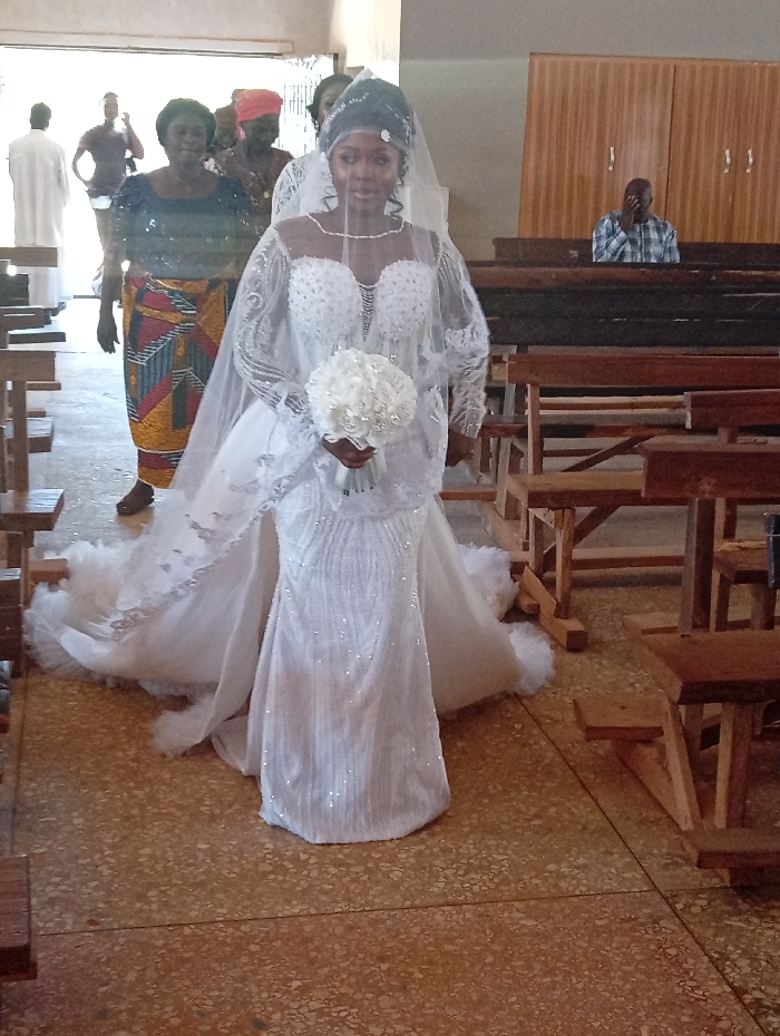 An interior view from a building in Pankshin, Nigeria, captures a wedding scene. Centrally, a female subject, appearing to be the bride, walks forward along an aisle. She is attired in an elaborate white wedding gown featuring extensive beadwork on the bodice, long sheer sleeves, and a long train with ruffled white trim. A sheer veil covers her face, and she holds a white, round floral bouquet adorned with embedded decorative elements. Behind her, to the left, an adult female with dark hair is visible, wearing a blue sequined top and a multicolored patterned wrap skirt, looking forward. Several other indistinct figures are present further in the background near an open doorway. To the right, an adult male with a bald head, wearing a blue and white patterned shirt, is seated in a wooden pew, looking towards the left with his hand near his face. The interior space features multiple rows of light-colored wooden pews on both sides of a central aisle. The floor is light brown terrazzo with visible grout lines, and a light-colored wall with vertical wooden paneling is in the background.