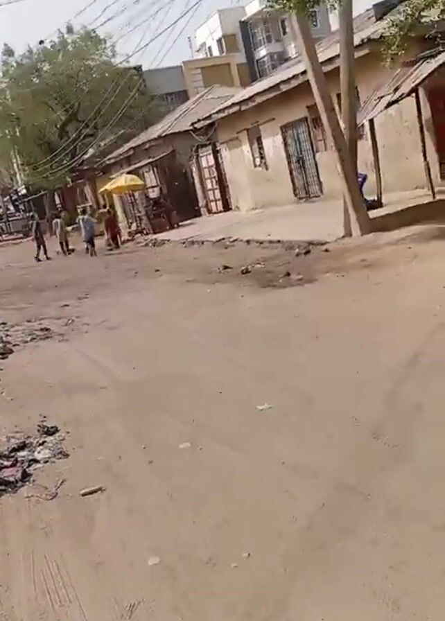 dirt road in a town. There are several people walking along the road, and some businesses are open on either side. There is trash in the road and the drainage ditch is broken. Overhead power lines are strung across the road. The general appearance of the neighborhood is run down.
