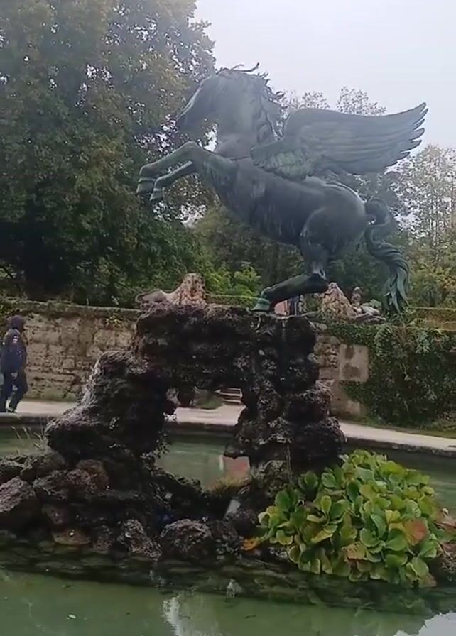 Pegasus statue in a pond in a park. The statue is dark and weathered and stands on a rocky mound in the center of the pond. The pond is murky green and reflects the sky and trees. The park has stone walls covered in vines, grass, trees, and a small building with a dome. The sky is overcast, and the weather appears foggy. A person walks along the edge of the pond in the distance.
