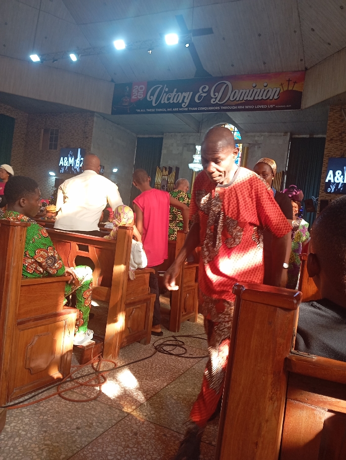 The image depicts an indoor gathering, likely a church service, located in Fegge, Nigeria