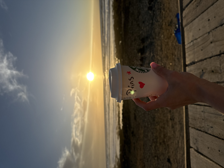 A Starbucks cup, labeled "Prins" with a heart and star, is held in someone's hand. The cup is positioned against a bright, setting sun reflecting on the ocean. To the right, a wooden boardwalk is visible. The background features a sandy or pebble-covered shoreline extending towards the horizon. The overall scene evokes a calm, beachside atmosphere.