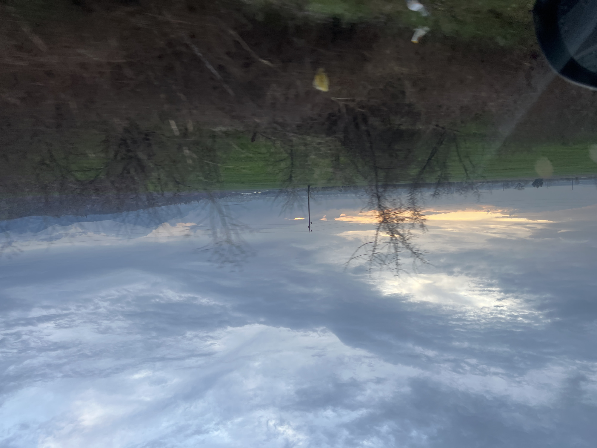 The image depicts a landscape observed from a moving vehicle, likely on the outskirts of Sliven, Bulgaria, during either sunrise or sunset. The sky, occupying the upper two-thirds of the frame, is heavily overcast with dense, grey, and blue-grey clouds. A horizontal band of orange and yellow light from the low sun is visible along the horizon on the left, breaking through the cloud cover. In the foreground, the lower portion of a black vehicle side mirror is visible in the bottom-left corner. The immediate foreground and midground are dominated by blurry, bare tree branches and dark brown, dry undergrowth, suggestive of late autumn or winter vegetation, indicating motion blur. Reflections and glare spots are visible on what appears to be a window, particularly in the lower-center. A faint yellow object, possibly plastic litter, is discernable among the branches in the lower-middle right. Beyond the immediate vegetation, a expanse of vibrant green field stretches horizontally across the midground. Further back, a tall, slender utility pole with power lines is silhouetted against the sky on the left side. Distant structures, possibly part of a town or industrial area, are vaguely visible on the horizon, hinting at the proximity to a developed area. The background features a range of dark blue-grey mountains, characteristic of the Balkan Mountain range near Sliven, obscured by atmospheric haze and the dim light. No individuals or direct interactions are visible. The environment appears to be a rural or semi-rural transition zone.