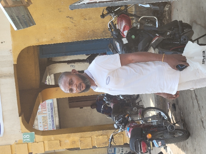 The image captures an outdoor urban scene in Suleja, Nigeria, in front of a building identified as "Precision Printing" and marked with the number "18." The primary subject, a male, stands centrally, facing the viewer directly. He has a shaved head and a grey beard, wearing a white short-sleeved collared shirt with a small emblem and white trousers. He sports a gold bracelet on his right wrist, holds a dark smartphone in his right hand, and a white plastic bag in his left hand. In the background, a yellow-painted building with archways features the "Precision Printing" sign, detailing "PRINTING & BOOK BINDING" services and contact numbers 08055557857, 08069779518. Another male is visible seated in shadow under an archway. Multiple motorcycles are parked on the paved ground, including a red motorcycle on the left and a dark-colored scooter to the right of the main subject. Bright daylight illuminates the scene.