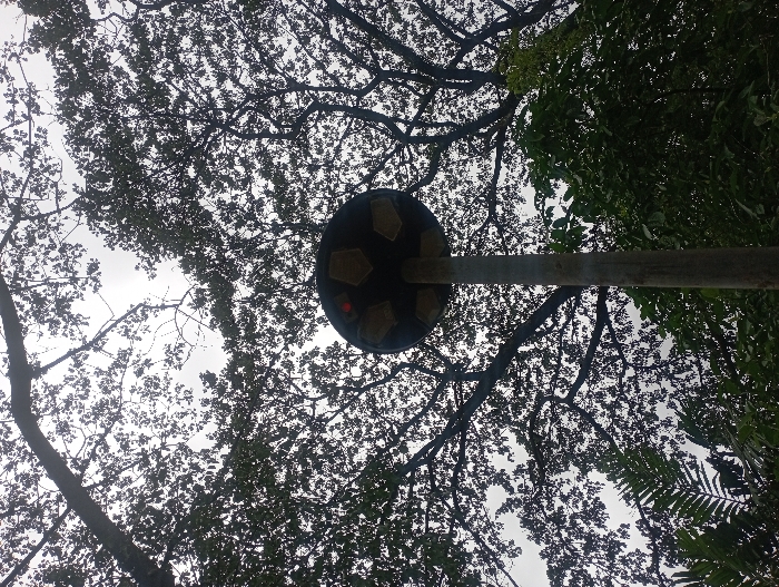 streetlight with a black hexagonal-shaped lampshade in the middle of a park in Meycauayan, Philippines. It's a cloudy day, and the light is surrounded by a dense canopy of trees. The streetlight has a round, gray pole. The trees are mostly bare, with some leaves remaining on them. There are no people or other objects in the image besides the streetlight and the trees. The coordinates are 14.772, 120.99, which are located in the city of Meycauayan, Philippines.