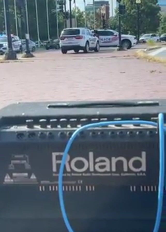 street scene with a Roland amplifier in the foreground. Behind the amplifier, there is a street with brick pavement. A white SUV and a police car are visible in the street, along with several people near the vehicles. There are flags flying in the distance, as well as buildings. The traffic light is yellow. A backpack is also visible in the frame. The scene appears to be a public area.