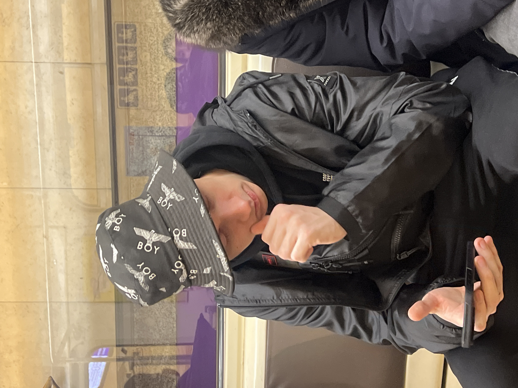 The scene depicts two individuals seated inside a subway car, consistent with the Saint Petersburg Metro system, at or near Shushary station, Russia. The primary subject, a young male, is seated on the left, facing generally forward but looking down at a dark-colored smartphone held in his left hand. His right hand is raised to his jawline. He is wearing a black bucket hat adorned with white "BOY" lettering and stylized bird/aircraft symbols, a black hooded sweatshirt beneath a black zip-up jacket featuring a small red patch on the left chest and a white logo on the right sleeve. His pants are dark. To his right, a second individual is partially visible, wearing a dark jacket with a prominent, shaggy brown and grey fur-lined hood. Both are seated on a light brown vinyl bench seat. Behind them, through a glass partition, a speckled beige/light brown wall, characteristic of a subway station platform, is visible, interspersed with purple reflections. The environment is artificially lit.