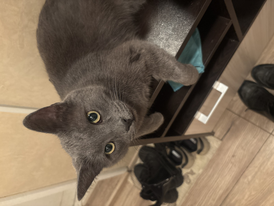 - "A grey domestic short-haired cat is observed lying on a dark brown, multi-tiered shelf unit within an indoor residential environment located in Sofia, Bulgaria" by FM-OMThs2, licensed under CC BY 4.0