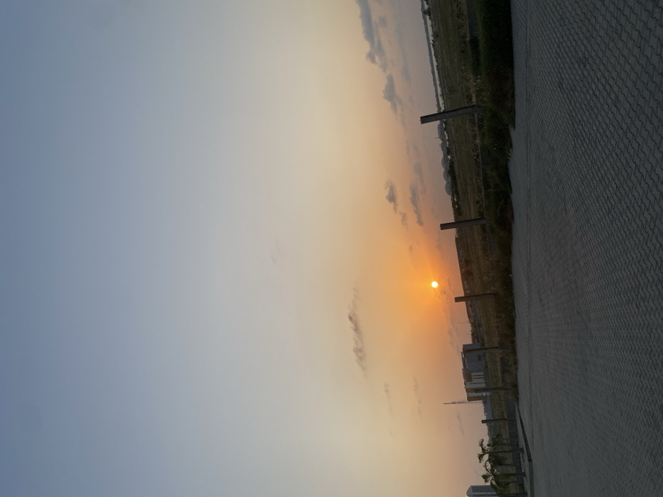 A sunset with an orange sun visible on the horizon. Wisps of clouds are scattered across the sky. A field with sporadic posts is on the right side, transitioning into a gray tiled surface. The left side is dominated by a muted blue sky. Some buildings and greenery are present in the lower right corner.
