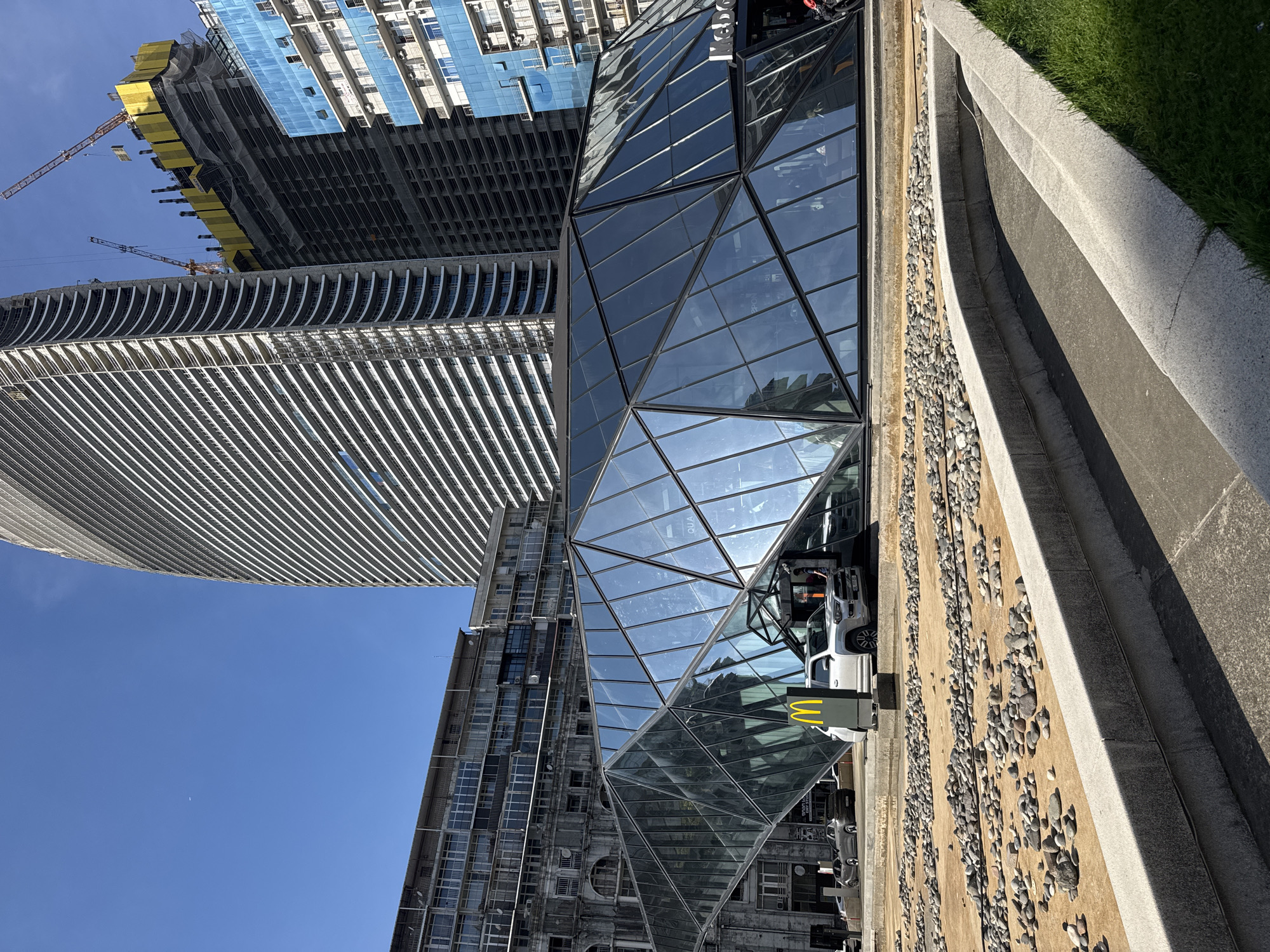 Here is a description of the image: The image captures a scene in a city, featuring a unique architectural building with a geometric glass facade, adjacent to a McDonald's. Several vehicles are parked nearby, suggesting a commercial area. In the background, high-rise buildings are visible, including one under construction with cranes. The foreground shows a landscaped area with rocks and grass. The location is in the city of Unknown, Unknown.