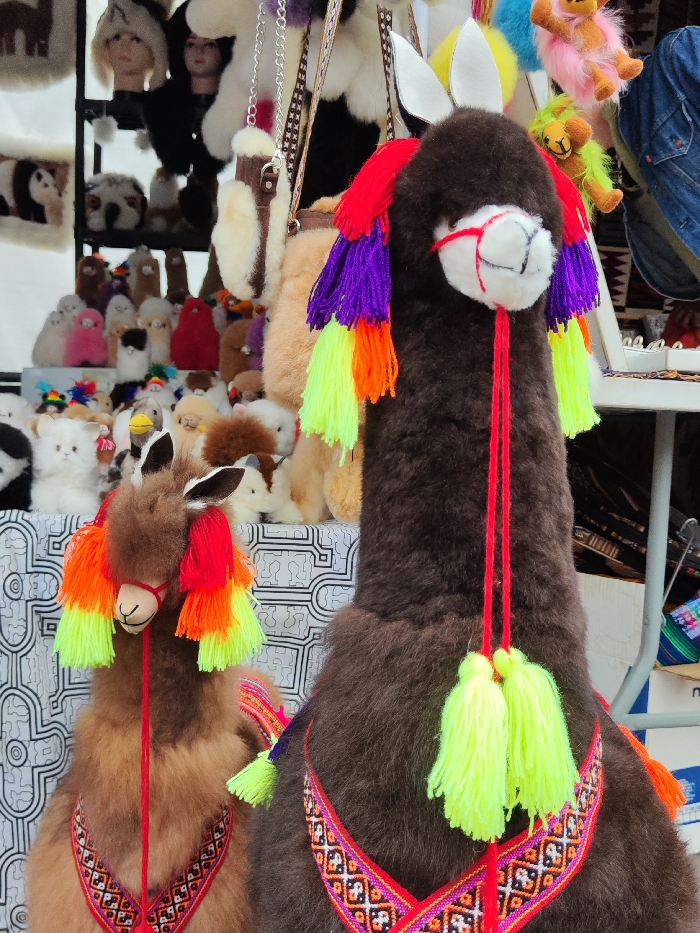 Two stuffed alpacas are in view. The first alpaca is brown and shorter with red, orange, and lime green yarn decorations. The second alpaca is taller and dark brown with red, purple, orange, and lime green yarn decorations. Both alpacas have colorful patterned harnesses. Many other stuffed animals are displayed in the background.