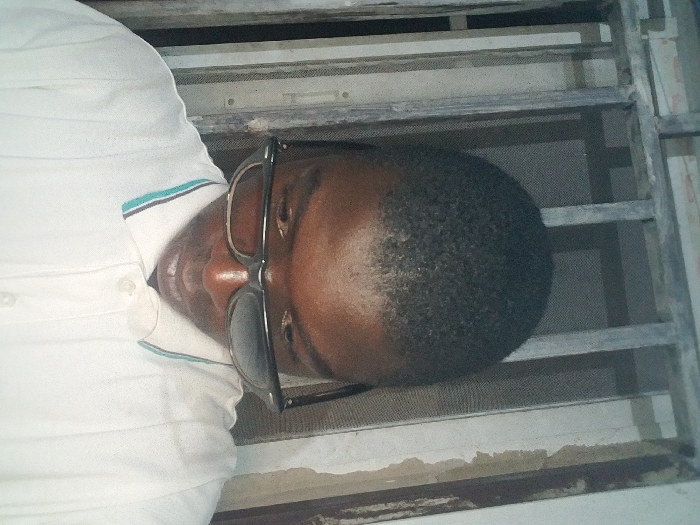A close-up of a man in a white shirt with a subtle teal trim on the collar. He has dark skin, close-cropped hair, and is wearing black-rimmed glasses. He is positioned in front of a window with metal bars and mesh. The image is taken at an unusual angle, making the man appear sideways in relation to the window frame. The overall impression is that of a casual, yet somewhat awkward portrait.