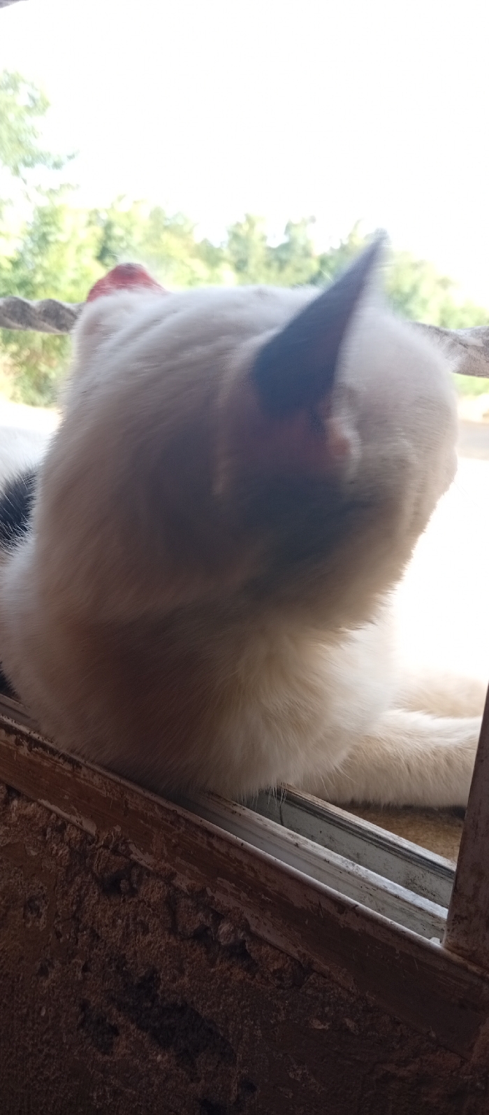 A domestic cat is depicted lying on a weathered window ledge, facing away from the viewer. The cat exhibits primarily white fur, with a distinct black patch visible on its left flank. The interior of its visible left ear presents a reddish tint, and its right ear appears dark. The animal's posture indicates it is looking out towards a brightly illuminated outdoor environment. The immediate foreground comprises a rough, brown, textured wall surface, surmounted by a worn window frame. The background is characterized by a highly overexposed outdoor scene, featuring blurred green foliage consistent with natural vegetation under strong daylight conditions. This scene is situated in Juan Griego, Venezuela.
