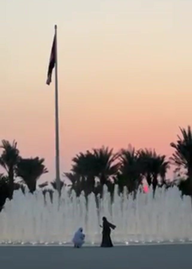 fountain with multiple jets of water in a large, square pool. Behind the fountain, there are palm trees and a tall flagpole with a black, white, red, and green flag. The sky is a gradient of colors ranging from pink to orange. Two individuals stand in front of the fountain. One individual is kneeling and wearing a white traditional Gulf Arab outfit. The other individual stands, wearing a dark abaya, and appears to be listening.