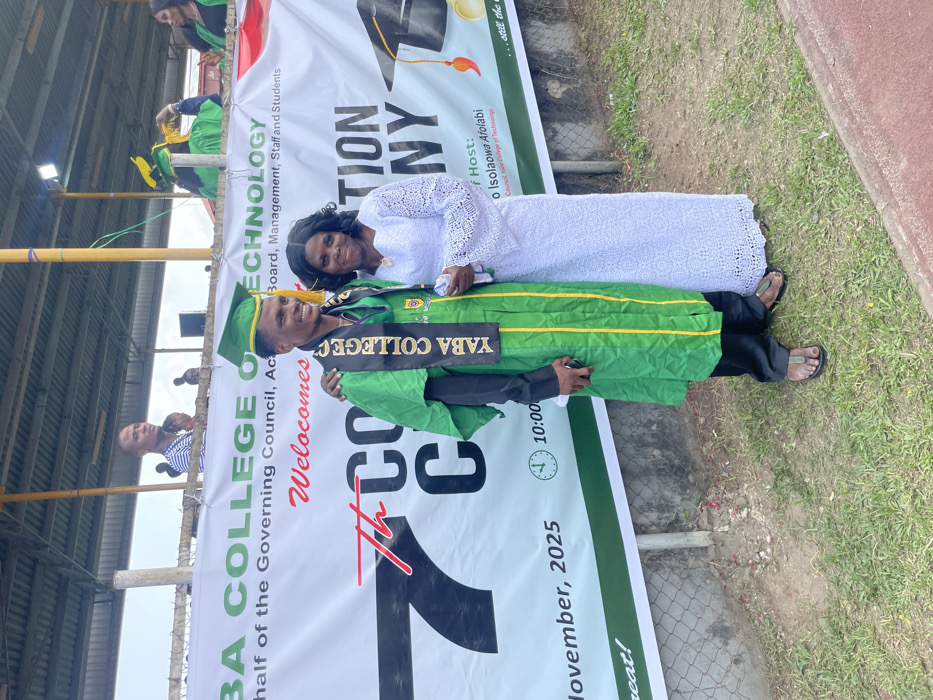 An outdoor scene depicts a male graduate and a female associate posing for a photograph during a convocation ceremony. The event is identified by a large white banner with green lettering as the "7th Convocation Ceremony" of "Yaba College of Technology," which is located in Ebute-Metta, Lagos, Nigeria. The banner also indicates a date of "November, 2025" and a time of "10:00." The primary subjects stand on a grassy area in front of the banner. The male, positioned on the left, is of slender build, with dark hair and a light complexion. He wears a green academic gown over a dark shirt and dark trousers, a green mortarboard with a yellow tassel, and a yellow and green sash emblazoned with "YABA COLLEGE." A medal hangs from a dark ribbon around his neck. He is smiling and holds a dark-colored mobile phone in his left hand. He wears open-toed sandals. The female, positioned on the right, is of average build with dark hair and a dark complexion. She wears a long-sleeved, floor-length white lace dress. She is smiling and has her left arm draped over the male graduate's right shoulder. Her right hand, holding a folded white item, rests near her waist. In the background, behind the banner, an elevated spectator stand with a metal roof is visible. Several individuals are present on this stand, including one male in a striped shirt. Other figures in academic regalia are also observable. The ground in the foreground consists of green grass and a reddish-brown track or pavement edge. A chain-link fence is visible behind the lower portion of the banner. The sky appears overcast.