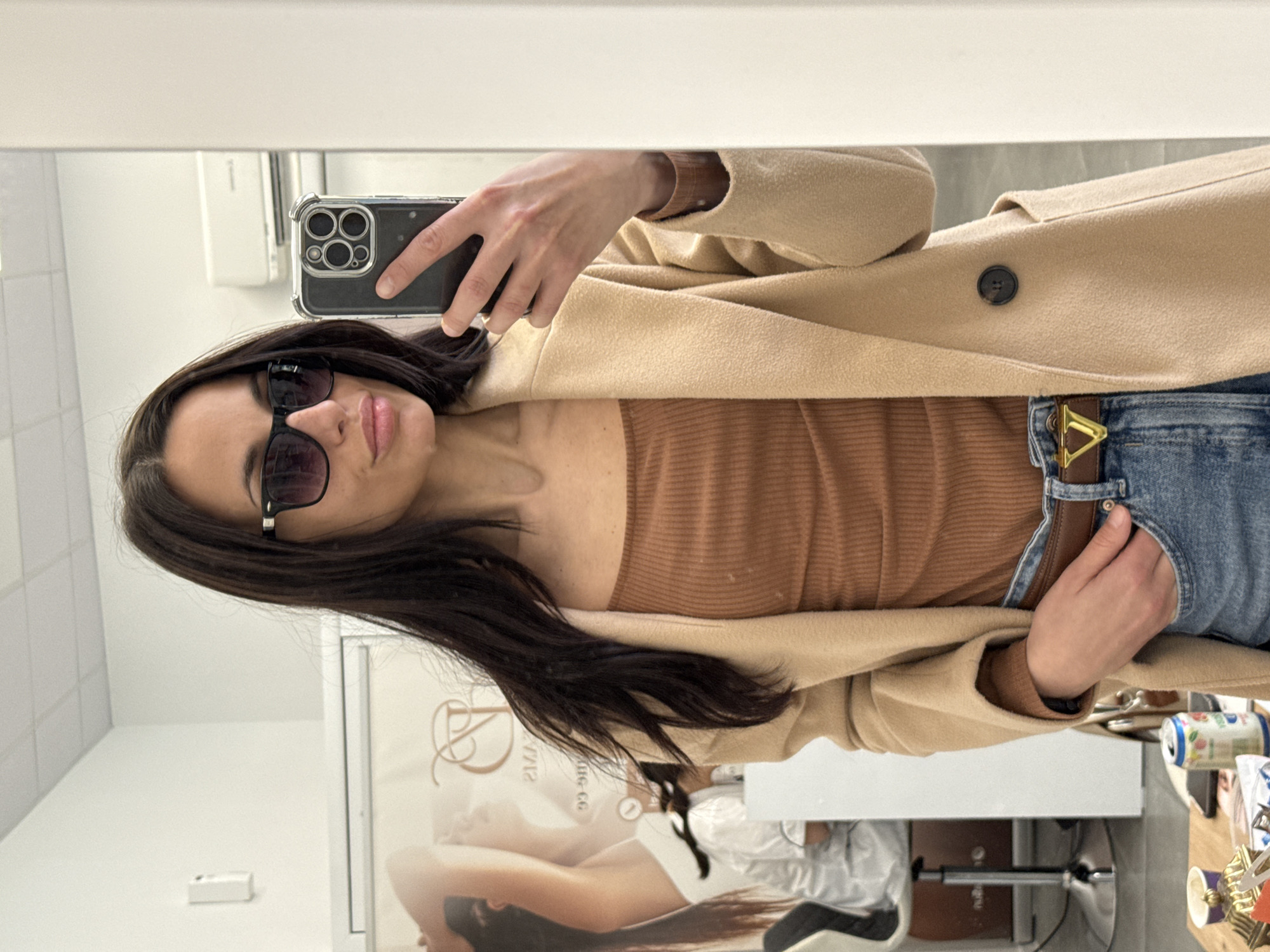 A woman is taking a mirror selfie indoors. She is wearing sunglasses, a brown top, a beige coat, and jeans with a belt. She is holding a smartphone. Behind her, there is a poster featuring a woman lying down. There is also a table with items on it. The location is inside an establishment, likely a beauty salon or a similar business. It is not possible to confirm the exact location in Pleven, Bulgaria without more information.
