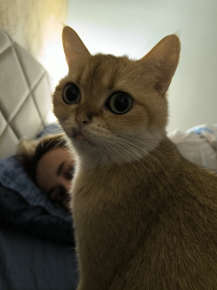 A golden-furred cat with large, captivating eyes dominates the foreground. Its alert ears are perked, and white whiskers fan out from its muzzle. Behind the cat, a person sleeps on a bed with a quilted headboard. The scene is bathed in soft, natural light, highlighting the cat's lustrous fur and the person's relaxed state. The composition draws attention to the cat's expressive face, creating a sense of curiosity and companionship.