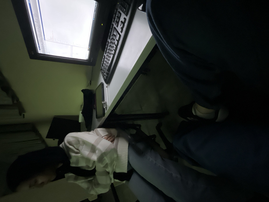The image depicts an indoor scene in Burjassot, Spain, set within a dimly lit room, likely a computer lab or office, illuminated by a greenish hue. On the left, a female subject is seated in a black office chair, facing away from the camera with her head turned left. She is attired in a dark headscarf, a cream-colored, horizontally striped sweater, and blue jeans, with her arms crossed. Her legs extend under a white desk. The desk surface contains several objects: a dark screen partially visible on the far left, a single black shoe, a dark tablet or smartphone accompanied by a white stylus, a black computer keyboard, and a prominent black CRT or thick LCD monitor displaying a white screen with legible lines of text or code within a program interface. In the lower right foreground, the legs and feet of a second individual are visible, clad in dark blue trousers and black sneakers with white soles and socks. No direct interaction between the two individuals is captured. The environment suggests a work or study setting.