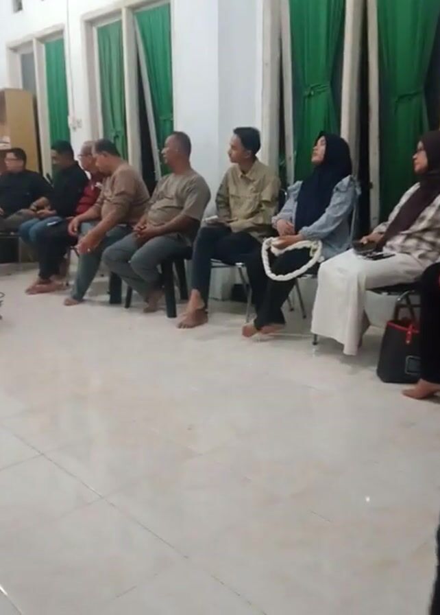 A brightly lit interior space contains a group of people, some seated on chairs along the wall, others sitting further into the room. All the people are casually dressed. One man in a white shirt and brown pants stands facing the seated group and appears to be speaking. In the background, a desk with a person seated at it is visible. Some people are taking notes.