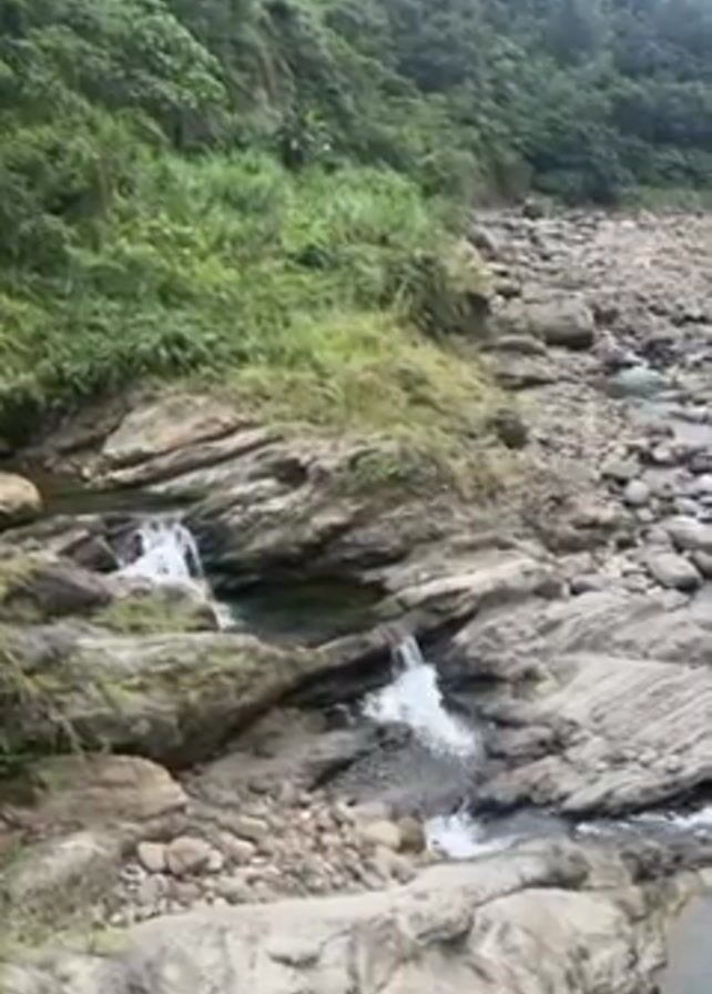 rocky riverbed with small waterfalls flowing over the rocks. The water is clear and the rocks are covered in moss. The river is surrounded by lush green vegetation on a steep hillside. The sky is overcast. The camera is static and there are no people visible in the video.