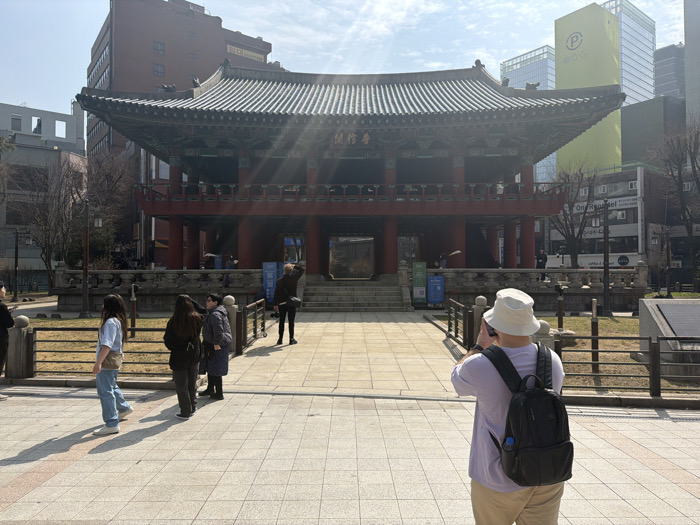 The image captures the Bosingak Bell Pavilion, a two-story traditional Korean structure with red pillars, a dark tiled roof, and intricate decorative eaves, located in Jongno, Seoul, South Korea. The pavilion features a stone balustrade surrounding its base and a central stone staircase leading to the main platform. A rectangular plaque with Korean characters is mounted above the main entrance on the upper level. In the foreground, a person with their back to the camera stands on a light-colored paved plaza. This individual wears a white bucket hat, a light purple t-shirt, khaki pants, and a black backpack, and is holding a smartphone in a horizontal orientation, appearing to photograph or record the pavilion. To the left of the frame, another individual in a light blue top and blue jeans walks from left to right. Further back, near the base of the pavilion, a small group of three people stands on the paved area, with one appearing to interact with another. A solitary individual in dark clothing is visible closer to the pavilion's stairs on the right side of this group. Blue information signs are affixed near the entrance stairs. The environment includes sparse grassy areas and metal railings bordering the pathway to the pavilion. In the background, a stark contrast to the traditional architecture is provided by modern high-rise buildings, including one prominent green building with a "P" logo and another displaying "OneRone Hotel" signage. Bare trees are visible, indicating either late winter or early spring. The scene is illuminated by bright daylight, casting long shadows from the subjects in the foreground.