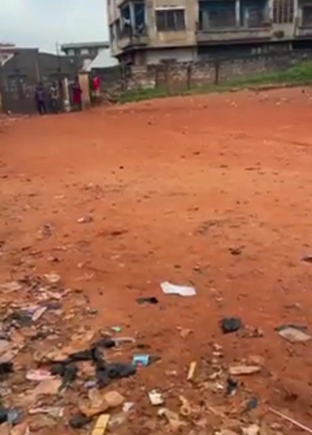 n urban scene with a dirt ground littered with trash in the foreground. Behind it is a dirt road leading toward a gate where several people are standing. In the background, there is a multi-story building that appears to be an apartment complex. To the left, there is a building with a poster on the wall and a wheelbarrow. The overall environment suggests a lower-income neighborhood or area with a lack of proper waste management.