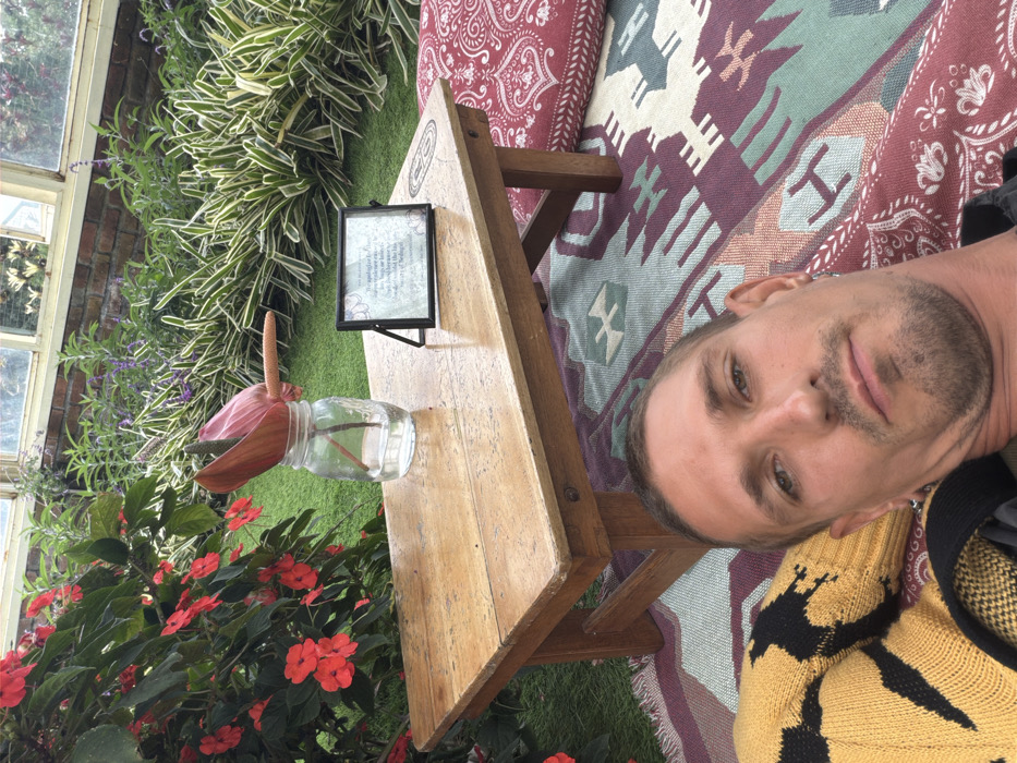 A man is lying on a cushion with a patterned rug. A small wooden table is positioned next to him. On the table are red flowers, a glass vase, and a framed sign. A variety of green plants and red flowers grow behind the table. The man has a fair complexion, short hair, and a slight beard. He is wearing a patterned sweater and facing the camera.