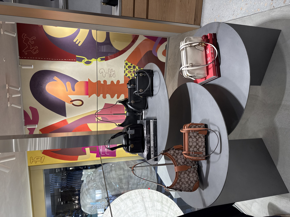 A display of Coach handbags rests on stacked, round, gray platforms. Three black leather bags of varying sizes are arranged near two books. On a higher platform, a cream-colored Coach purse sits atop a red book. Another platform features two brown Coach bags with a repeating logo pattern. A vibrant mural with abstract shapes and figures serves as a backdrop.