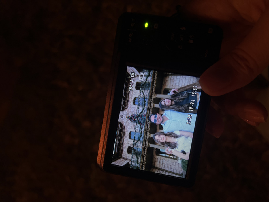 A digital camera shows a photo on its screen. The photo depicts three people in front of a building adorned with Christmas decorations. A man in blue sunglasses stands between two women. The date "2026 12-24 15:53" is displayed on the screen. The camera is being held in someone's hand. A green light is visible on the camera's top surface. The background is dark and blurry.