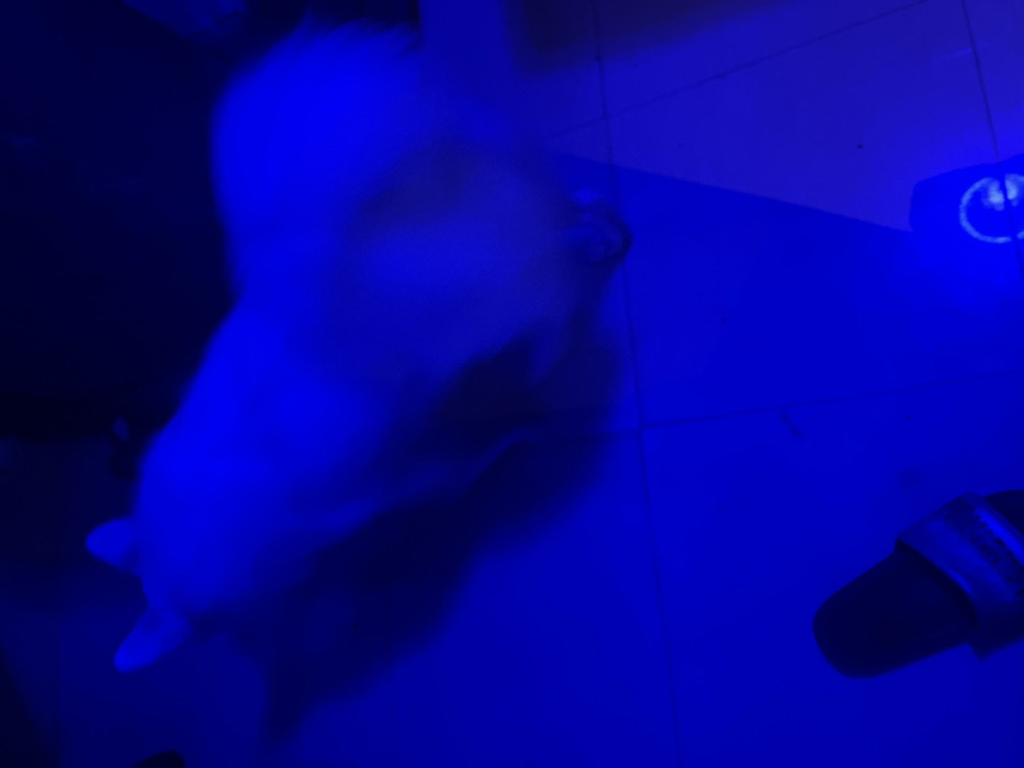 A fluffy white dog stands in a room illuminated by bright blue light. The dog's fur appears blurred, suggesting movement. Tiled flooring is visible, along with dark shadows cast by objects. A pair of dark-colored slides rests near the edge of the frame. A bright, circular light source is also present. The overall image has a strong, monochromatic blue tone.