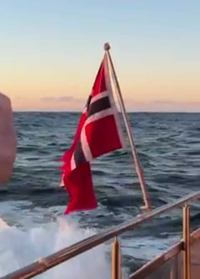 boat moving across the ocean at sunset. The Norwegian flag is displayed on the back of the boat. Waves are created by the movement of the boat. The sky is a gradient of colors, from blue to orange.
