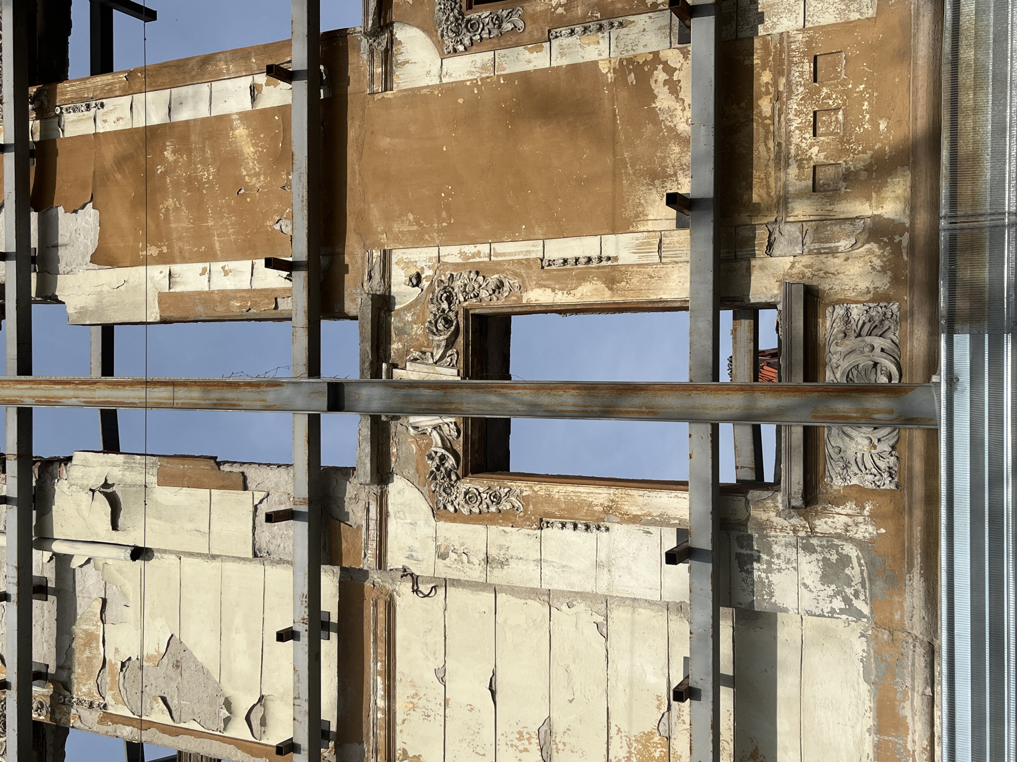 This image presents a detailed, eye-level view of a severely degraded building facade in Plovdiv, Bulgaria, extensively supported by an external metal scaffolding system under a clear blue sky. The facade exhibits significant deterioration, with large sections of faded off-white and desaturated orange-brown plaster peeling, cracking, and missing, exposing underlying gray masonry across multiple levels. Key architectural features include two prominent, rectangular window openings, devoid of frames or glass, flanked by ornate stucco or carved stone ornamentation depicting floral and scroll motifs. Additional decorative moldings, cornices, and pilasters are visible. The lower right section of the orange-brown wall contains three recessed square panels. The robust metal framework comprises horizontal I-beams and vertical structural steel posts, including a prominent central support, secured to and extending through the facade, with projecting brackets bracing various sections. The metal components show weathering and light surface rust. A low, horizontally oriented barrier of corrugated, reflective metal is positioned at the bottom of the frame. No individuals or active work are visible within the scene.