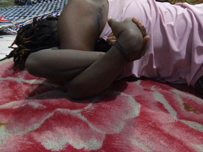 A person lies on a floral-patterned blanket. Wearing a light pink shirt, the person’s right arm is bent, with their hand touching their shoulder. Their dark hair is styled in dreadlocks. The patterned bedsheet is visible in the upper left corner.