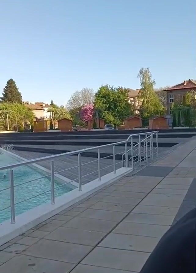 modern fountain in a town square on a sunny day. The fountain consists of several interconnected pools with light blue water, surrounded by a white ledge. A brushed metal railing runs along the edge of the fountain. Behind the fountain are tiered wooden platforms, leading to small wooden structures that could be kiosks or seating areas. The backdrop includes residential buildings and trees, with a clear blue sky above. The camera pans slightly to the left, revealing more of the fountain and the surrounding townscape.