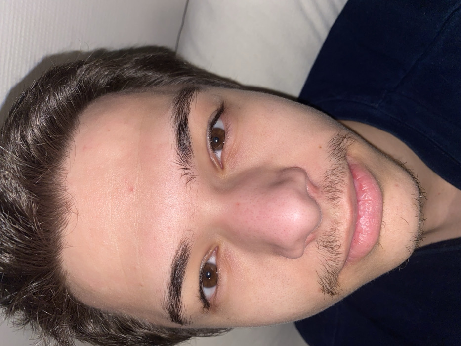 A close-up, head-and-shoulders portrait depicts a young male looking directly forward