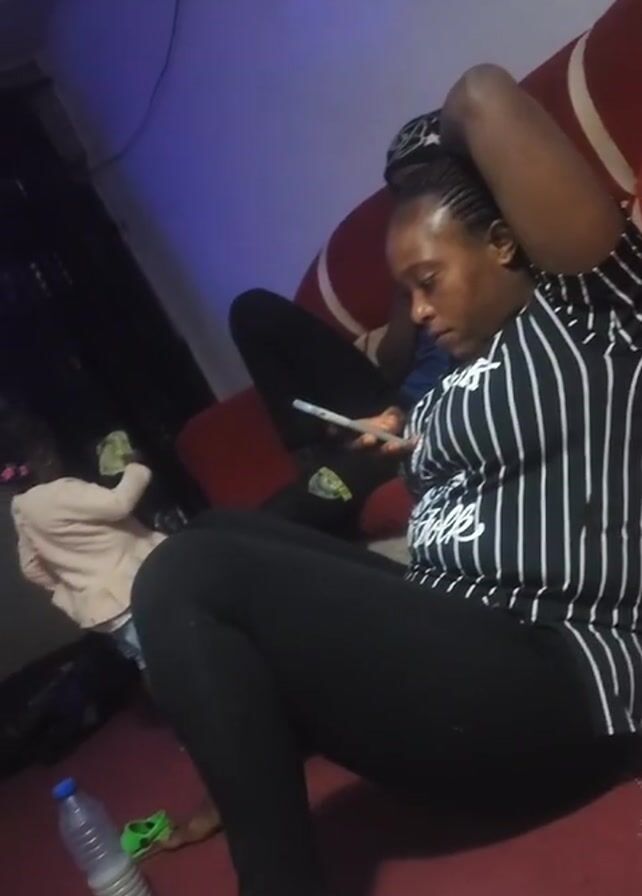 . The scene is indoors, possibly a living room, with a woman sitting on the floor, legs crossed, focused on a smartphone she holds in her hands. She is wearing a black and white striped shirt and black leggings, with her hair pulled back. Behind her on a red couch, a man is seated, his hands clasped behind his head. In the background to the left, a young child is standing near what appears to be a speaker. A water bottle and a small toy are on the floor nearby. The room is lit with a cool-toned light.