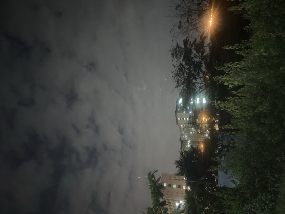 Nighttime scene with a cloudy sky dominating the left side of the frame. Buildings with illuminated windows are visible amidst trees and shrubbery on the right. Streetlights add points of bright light. The overall atmosphere is dark and slightly hazy.