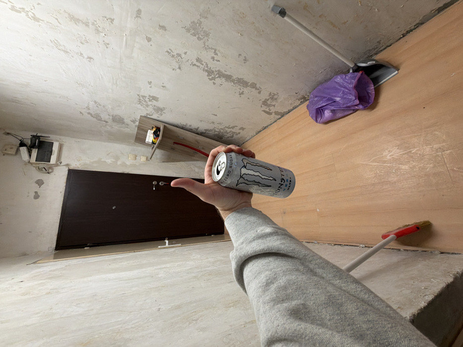 This image captures an indoor corridor within a residence in Radomir, Bulgaria. The primary subject is a human right arm, clad in a grey long-sleeved garment, extending from the left foreground. The hand holds an open, silver-colored Monster Ultra Zero Sugar energy drink can, with the thumb extended upward in a "thumbs-up" gesture. The environment depicts a narrow hallway with light-colored, possibly off-white, walls exhibiting significant plaster damage, peeling, and uneven textures, suggesting an unfinished or deteriorated state. In contrast, the floor is covered with light-brown laminate flooring, appearing relatively new or recently installed. At the end of the corridor, a dark brown door, likely an entrance door, is visible, equipped with a handle, a keyhole containing a key, and a security peephole. To the left of this door, a white door frame indicates another passage. On the right wall, towards the ceiling, exposed electrical wires, a white electrical junction box, and a disassembled electronic device are affixed. Below these, two cream-colored electrical outlets or switches are present. Further down the right wall, a small, light-colored wooden shelf is mounted, holding several small objects. Leaning against the wall beneath the shelf is a wooden board. On the floor to the right, a purple plastic bag rests next to a grey dustpan with a white handle. A broom with a red head and yellow bristles is partially visible on the floor to the left. The scene suggests a period of ongoing cleaning or renovation activity.