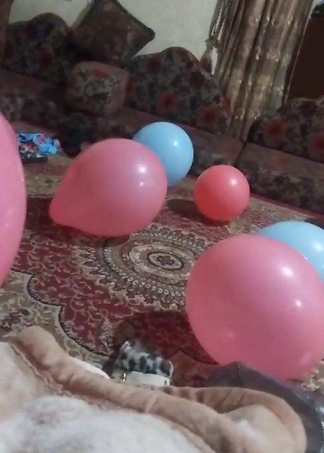 living room with a red patterned carpet and a couch with decorative cushions. Scattered on the carpet are several balloons in shades of pink and blue. A beige blanket partially obscures the lower portion of the frame. A small grey and white object is visible beneath the blanket. The camera is positioned low, possibly held or resting on the blanket. There are no apparent people or explicit actions visible in the video.