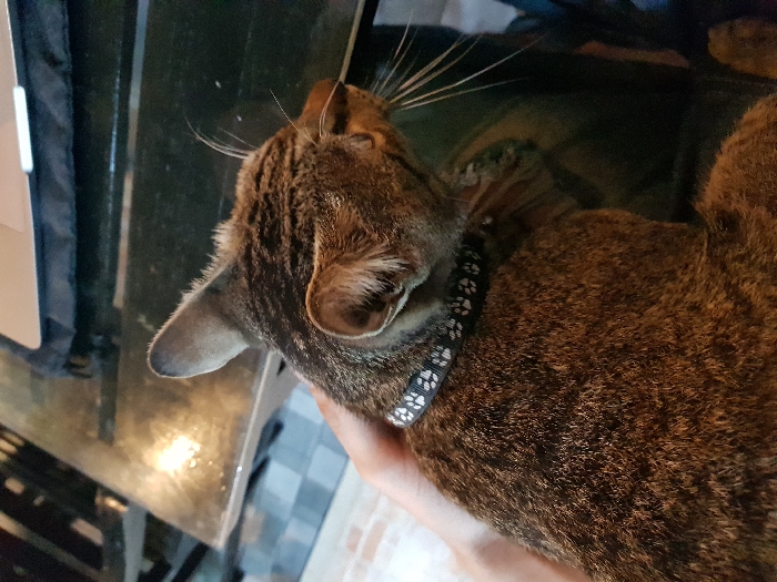 - "A tabby cat with a paw print collar is lying down, its head resting on a person's hand" by FM-ISafB3, licensed under CC BY 4.0