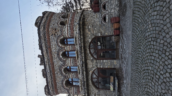 The image depicts a two-story building constructed primarily of roughly cut stone and red brick, featuring a distinctive architectural style. The structure is located in Lukovit, Bulgaria. The upper story presents a series of four arched windows with dark frames, set within a facade adorned with alternating stone and brick patterns. A decorative brick frieze with triangular elements and a wider red brick band runs beneath the window sills, while a larger decorative emblem or crest is visible on the upper right facade. The rooftop edge features a crenellated or battlements-like design. The ground floor consists of two large, arched entrances or display windows with dark wooden frames and glass panes, revealing interior reflections. To the left of the left entrance, a weathered wooden bench with a partially painted surface rests on the paved area. To the right of the right entrance, several large terracotta or clay pots, varying in shades of brown and red, are arranged on the ground. Further to the right, a section of the stone wall features two smaller arched openings, and several more terracotta pots are placed on a ledge beneath these openings. The foreground consists of a cobblestone pavement laid in a fan-shaped or arched pattern. Bare tree branches are visible on the far right side of the image, suggesting a dormant season. Overhead, against a pale blue sky with minimal cloud cover, multiple utility wires or cables are present. There are no individuals present in the scene, and no specific actions or interactions are depicted.