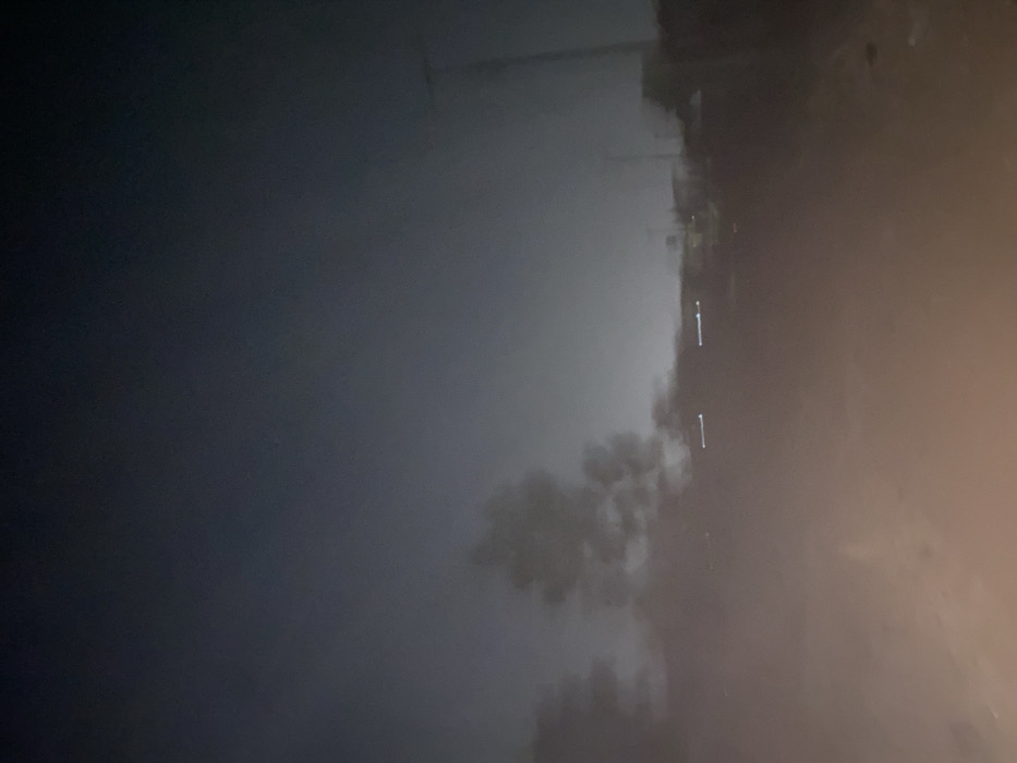 hazy, dark scene, possibly at night or in dense fog. Two bright vertical lines are visible, suggesting streetlights or similar light sources. Hints of trees or foliage can be seen in the lower portion of the picture. The overall atmosphere is obscured by heavy fog or darkness. The scene appears to be a landscape with limited visibility.