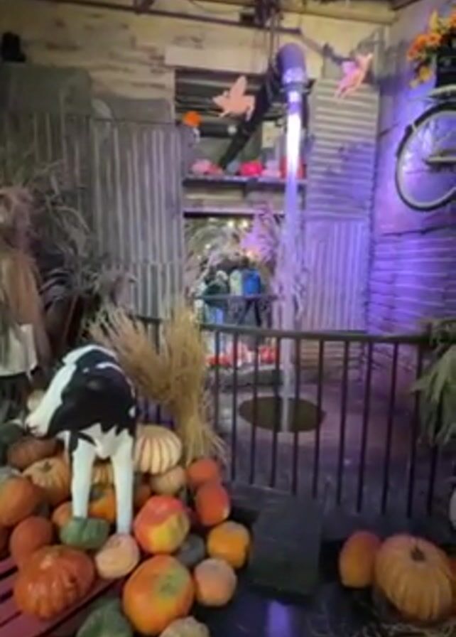 Halloween display with a farm theme. There are many pumpkins of various sizes and colors. A black and white cow statue stands among the pumpkins. Behind the pumpkins is a barrier and behind that a display of lights and pumpkins. Above the display is a bicycle with a dummy wearing jeans riding it. The wall is decorated with galvanized metal. There are also scarecrows and hay decorations around the pumpkins.