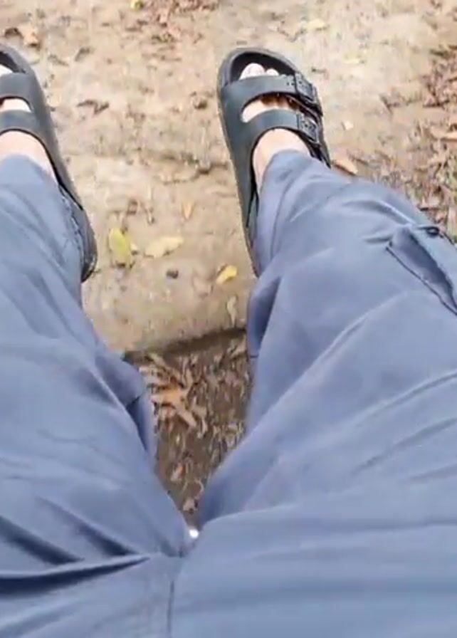 first-person perspective of a person seated with their legs extended and swinging back and forth. The person is wearing gray cargo pants and black sandals. The ground below alternates between dirt with leaves and grass. In the background, there is a wooden fence and some greenery. The camera angle is stable, focusing on the person's legs and the immediate ground area.
