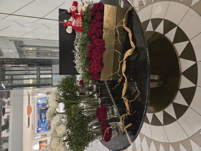 The image depicts a static indoor scene within what appears to be the lobby or a common area of a high-end establishment, specifically identified as the Grand Hotel Millennium Sofia, Bulgaria, based on architectural features including the distinctive glass elevator shaft. In the foreground, a large, round table with a polished dark marble top and a metallic base serves as a central display. On the left side of the table, multiple clear cylindrical glass vases hold arrangements of white roses interspersed with green foliage. Several shorter clear glass vases contain clusters of red roses. Across the center and right side of the table, several dried, gnarled, golden-colored root-like structures are arranged. On the right, a rectangular golden-colored planter contains numerous tightly packed red roses, surrounded by white baby's breath and green foliage. Behind this planter, a tall, black rectangular panel is visible. To the right of the planter, two traditional Bulgarian *martenitsa* figures, depicted as stylized red and white yarn dolls, are suspended. The background reveals a brightly lit, modern interior space. A prominent, transparent glass elevator shaft with metallic vertical supports is visible centrally. Walls feature a clean, white aesthetic with subtle geometric patterns, including diagonal lines on the right. Further into the background, an open area with modern seating arrangements (chairs and tables) and abstract artwork on the walls is discernible. The floor beneath the display table exhibits a distinctive radial pattern of light and dark triangular tiles. No individuals are present in the frame, and no actions or interactions are depicted.
