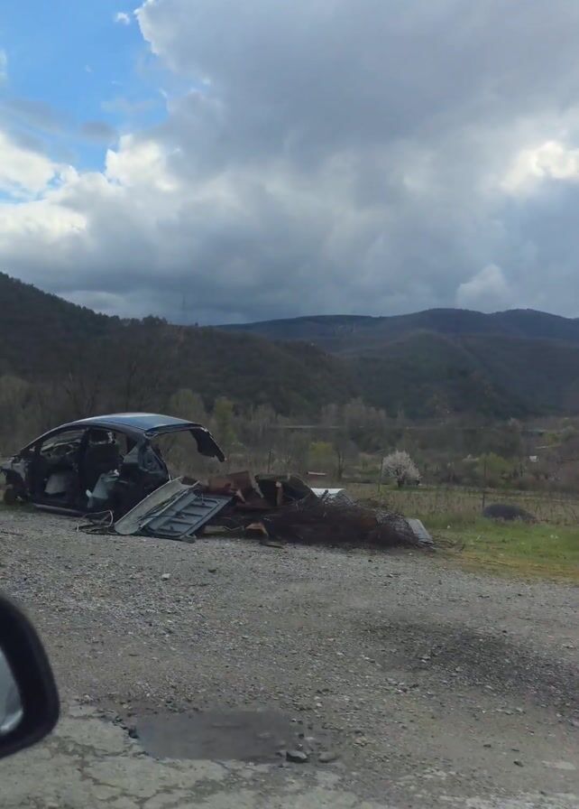 mangled and burned-out remains of a car on the side of a gravel road. The car is black, but heavily damaged, with its doors, roof, and much of its body missing. Debris and other car parts are scattered around it. The setting appears to be rural, with fields and hills in the background under a cloudy sky. The camera is moving as if from a passing vehicle. A car mirror is visible in the lower left corner of the frame.