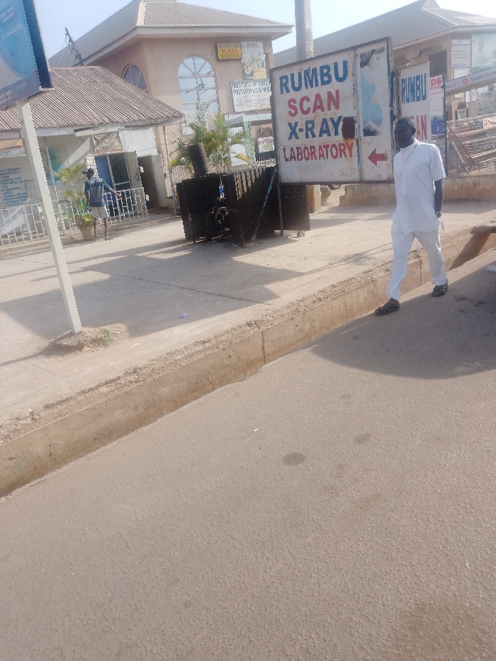 This image depicts a street scene in Sabon Tasha, Nigeria. In the foreground, a paved asphalt road extends across the lower portion of the frame. A light-colored concrete curb separates the road from the sidewalk. On the right side of the sidewalk, a male individual, observed from the chest down, walks from the right towards the left. He is dressed in a white long-sleeved tunic and matching white trousers, with dark shoes. His right hand is placed into his pocket. His shadow is cast prominently on the sidewalk and partially on the road. To the left of this individual, a large, dark, rectangular metallic enclosure, possibly a transformer or generator unit, rests on the sidewalk. It exhibits weathering and some damage. Further to the left, a tall, slender white pole is visible, supporting signage. In the mid-ground, a prominent freestanding sign displays the text "RUMBU SCAN X-RAY LABORATORY" in blue and red lettering, with a red arrow pointing to the left. Behind this sign, a multi-story building features a distinctive, complex roofline with multiple angles and gables. The building facade is a light brown color, incorporating arched windows and various commercial signs, including "INSTITUTE OF SAFETY PROFESSIONAL" and "PLAZA." To the left of this main building, a smaller structure with a brown corrugated metal roof is visible. A second male individual is partially visible in the left background, standing near the smaller building's entrance. He wears a dark shirt and light shorts, near a white metal railing. The environment is brightly lit by natural sunlight, casting distinct shadows, indicating daytime conditions.